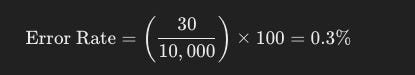 Example Calculation: If there are 10,000 user transactions in a month and 30 of them fail, the error rate would be:
